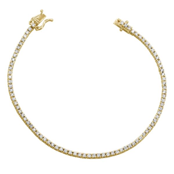 This timeless 14kt gold diamond traditional tennis bracelet is set with 95 round brilliant cut diamonds totaling 1.00 ct tw. It is perfect for everyday wear or an evening out on the town. All diamonds are hand selected in Antwerp, Belgium, and all pieces are hand set by our master craftsmen. 4 prong, straight row bracelet. 7 inch length. (Color: Yellow Gold;)