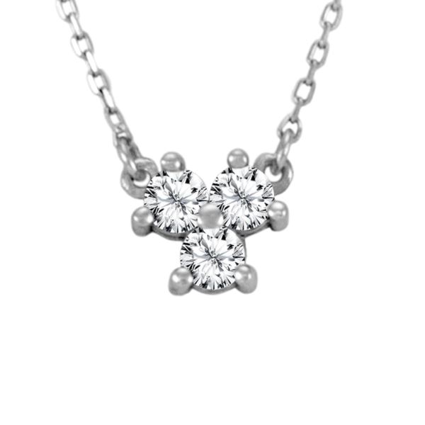 Antwerp's beautiful and stylish tiffany-style trilogy necklace. This pendant is made in 14kt gold. It features 3 brilliant cut diamonds totaling .50 ct tw. This is a classic three diamond drop in the conventional triangle style for everyday wear or a fancy evening out. All diamonds are hand set by our master craftsman. 16 inch chain, connected at each end of the pendant. (Color: White Gold;)