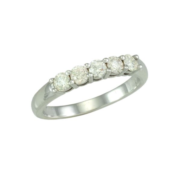 Our beautifully classic five diamond wedding band illuminates unsurpassed brilliance. Sparkling diamonds and gleaming 14kt gold combine in a simple design she can wear every day. A prong basket style setting lets the true beauty of the diamonds shine through. 5 round brilliant cut diamonds weighing .50 carats. standard sizes 5-7. (Size: 12; Color: White Gold;)