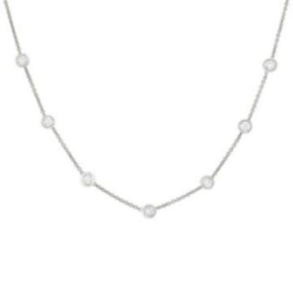 14kt gold "Diamonds by the yard with Drop" necklace, bezel set with 7 brilliant cut diamonds totaling .50 carat tw. Classic diamond by the yard necklace with added drop portion. All diamonds are hand-set by master craftsmen. This is a 16" necklace with 3 inches added for the drop portion. Each diamond is well spaced for perfect symmetry. (Color: White Gold;)