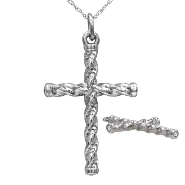 Antwerp Designer "Twisted" Diamond Cross Necklace is a designer brilliance. This is a beautifully designed and detailed cross pendant and is made in 14kt gold. The pendant is accentuated by three round brilliant cut diamonds weighing .03 carats bezzeled on each end of the cross. They are set by our master craftsman in the USA. Necklace includes a 16" gold chain. Pendant=32 x 18 MM. (Color: White Gold;)