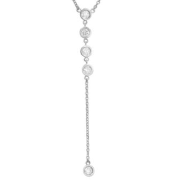 Gracefully minimalist yet strikingly elegant, this 14-karat gold lariat necklace features five brilliant round diamonds totaling 0.36 carats, delicately set along the drop. Measuring 16 inches long with a 2-inch drop. This stunning silhouette is available in 14 karat white gold or a two-tone white and yellow gold finish. All diamonds are imported from Antwerp Belgium, the diamond capital of the world. Hand-set by our master craftsman in the USA. (Color: White Gold;)