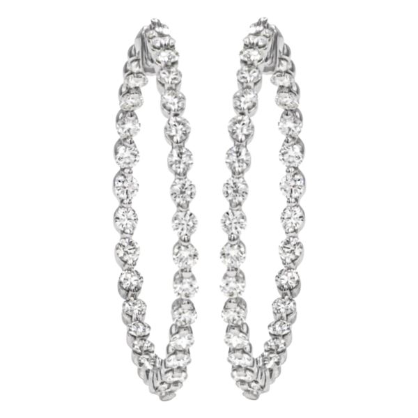 Antwerp's elegant diamond hoop earrings made in 14kt gold. These earrings are single/shared prong set with 62 brilliant cut diamonds totaling approx. 3 carats, both inside and outside the settings. Each piece is hand set by our master craftsmen, and each diamond is hand selected in Antwerp, Belgium, the diamond capital of the world. 31 mm diameter, 1.25 inches. (Color: White Gold;)