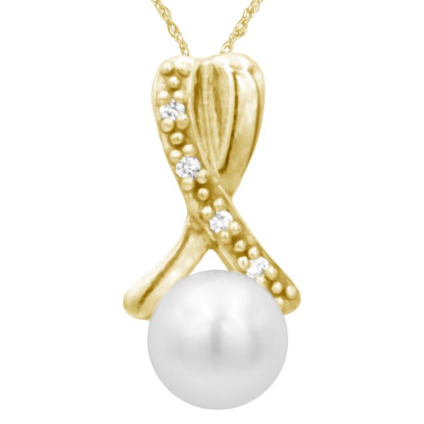Modern elegance meets timeless charm in this crisscross pearl post pendant. Featuring a luminous 6-6.5 mm cultured pearl nestled at the heart of a delicate crisscross design, accented with four brilliant-cut diamonds totaling 0.03 carats. This pendant is 18 mm long and finished with a fine 16-inch cable chain, available in 14-karat white and yellow gold. All diamonds are imported from Antwerp Belgium, the diamond capital of the world. Hand-set by our master craftsman in the USA. (Color: Yellow Gold;)