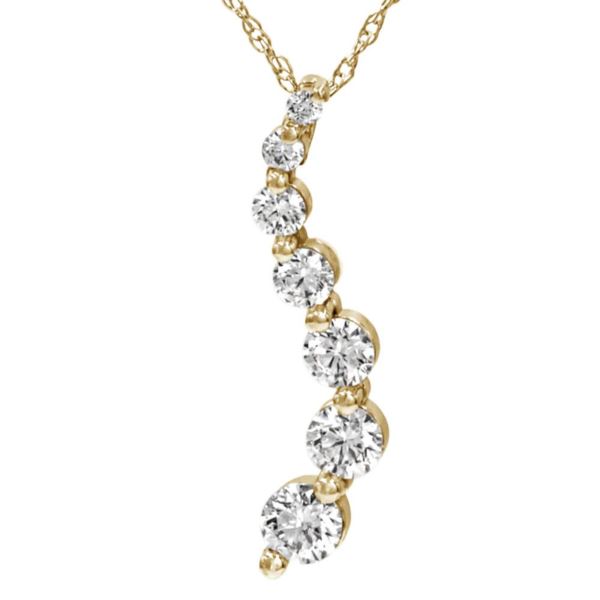 14kt gold diamond "Journey" pendant prong set with 7 brilliant cut diamonds totaling 1 1/4ct tw. Beautifully graduated diamonds from small to large vertically integrated down the neckline. Length=28 mm, 1.15 inches (Color: Yellow Gold;)
