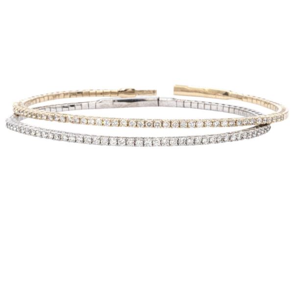 This lightweight "Flex" bangle bracelet is made in 14kt gold, and is prong set with 45 round brilliant cut diamonds totaling .80 carats across the top half. The bracelet has nice flexibility and movement with your arm. It measures 1.20 mm thickness, 2.25 x 1.90 inches diameter, and includes a sleek, hidden clasp. Perfect for stacking!. Simple and elegant. (Color: Yellow Gold;)