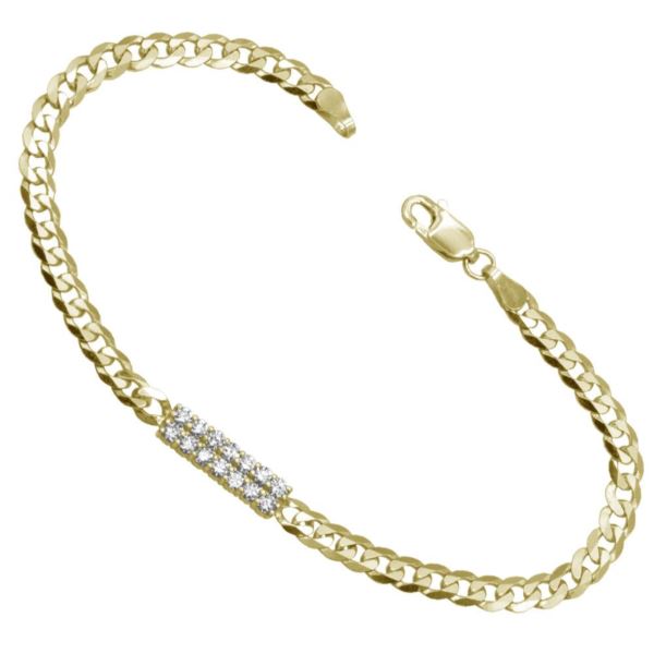 This sparkling 14kt gold "Diamond Bar" bracelet with double row of diamonds is set with 14 round brilliant cut diamonds totaling .50 cts tw. Multiple curb links designs interconnect together all the way across the wrist. All diamonds are hand-picked in Antwerp, Belgium, the diamond capital of the world. Each diamond is hand-set by our master craftsman. 4.50 mm width, 7 inches length. special sizes are available. (Color: Yellow Gold;)