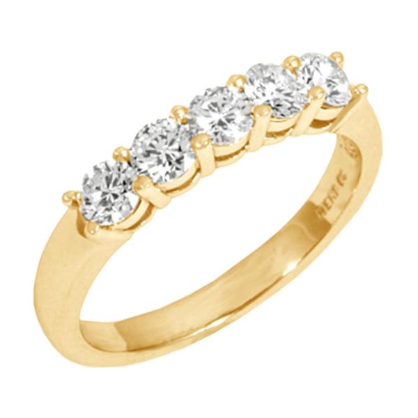 Our beautifully classic five diamond wedding band illuminates unsurpassed brilliance. Sparkling diamonds and gleaming 14kt gold combine in a simple design she can wear every day. A prong basket style setting lets the true beauty of the diamonds shine through. 5 round brilliant cut diamonds weighing 1.50 carats. standard sizes 5-7. (Size: 8; Color: Yellow Gold;)
