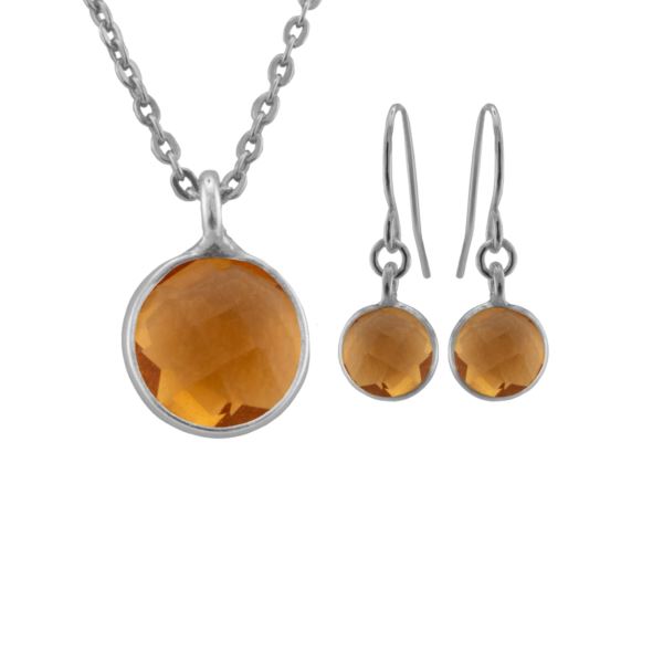 This elegant jewelry set pairs a minimalist 7mm round citrine quartz necklace with matching bezel-set dangle earrings, all crafted in polished sterling silver. The rich hues provide a subtle pop of color, while the clean lines and simple French wires of the earrings complement the sleek 16" cable chain of the necklace. Versatile and timeless, this set is perfect for adding a touch of refined color to everyday looks or special occasions. Matches ER260314/PD260314.