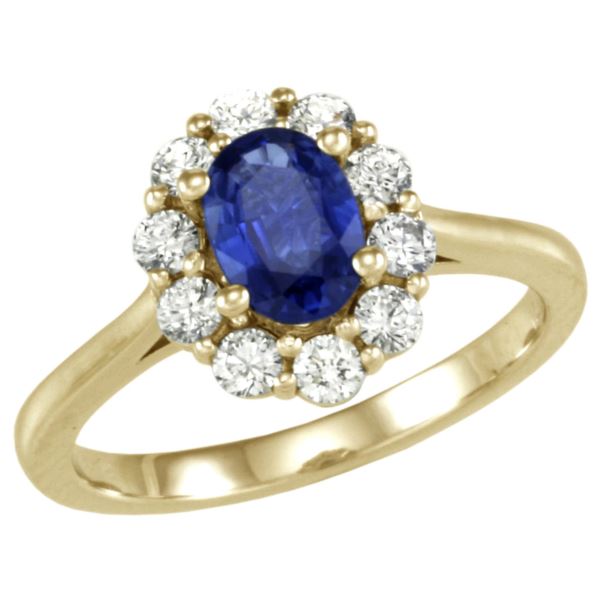 Antwerp "Princess DI" fashion ring with sapphire center. Any woman would love this classic but fashion forward jewelry piece. This beautiful ring is made in 14kt gold, and includes approx .90 carat oval genuine sapphire (7 x 5 mm). It also features 10 brilliant cut diamonds weighing .45 ct tw which completely surround the center oval. All pieces are set by our master craftsman. Each diamond is hand-picked in Antwerp, Belgium, the diamond capital of the world. (Size: 5; Color: Yellow Gold;)