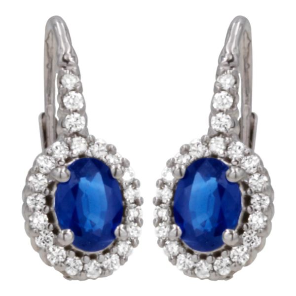 Antwerp "Princess Di" dangle earrings with gorgeous blue sapphire centers. The halo style with a rope design is made in 14kt gold, and includes 2 oval genuine sapphires weighing approx. 1.50 carats total weight. It also features 42 round brilliant cut diamonds weighing .45 ct tw which surround each sapphire. All pieces are set by our master craftsman. Each diamond is hand-picked in Antwerp, Belgium, the diamond capital of the world. centers=7 x 5 mm each. dimensions earrings= 19 x 9 mm. (Color: White Gold;)