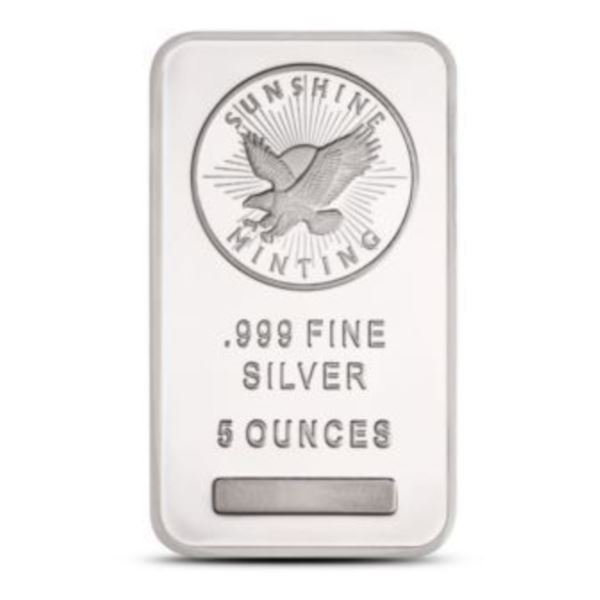 Quantity of 3, 5 Oz Silver Bar - Sunshine of Highland or other refinery - .999 Fine Silver with stamping. Sunshine operates one of the USA's largest and most efficient integrated precious metals plants. Measurements=2.33 x 1.33 inches, Bar only. Possible substitute of refiners if necessary.