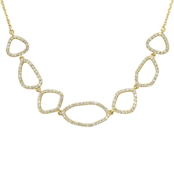 New "Multi-Dimensional" necklace shows fashion in stylish shapes and sizes.This beautiful necklace is set in 14k gold with 148 round brilliant diamonds totaling 1.00 carats tw. All diamonds are hand-set and prong-set by master craftsmen. This is a 17" necklace. A one of a kind design. (Color: Yellow Gold;)