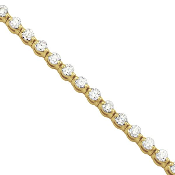 Illuminate ladies wrist with the timeless look of this gleaming 14kt gold shared-prong diamond tennis bracelet. This piece is set with 43 round brilliant cut diamonds totaling approximately 4 ct tw. It is perfect for an evening out or elegant enough for everyday wear. Every diamond is hand picked in Antwerp, Belgium, the diamond capital of the world, and all of our pieces are hand-set in the USA . 7 inch length. (Color: Yellow Gold;)